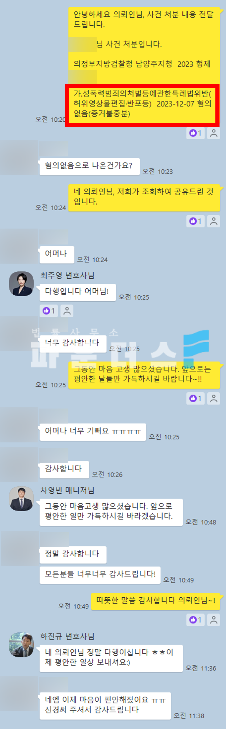 이와 같은 밀착 조력 끝에 의뢰인은 성폭력범죄의 처벌 등에 관한 특례법 위반 (허위영상물 편집 ㆍ반포등)의 혐의에 있어 혐의없음(증거불충분) 처분으로 억울함을 풀 수 있었습니다.