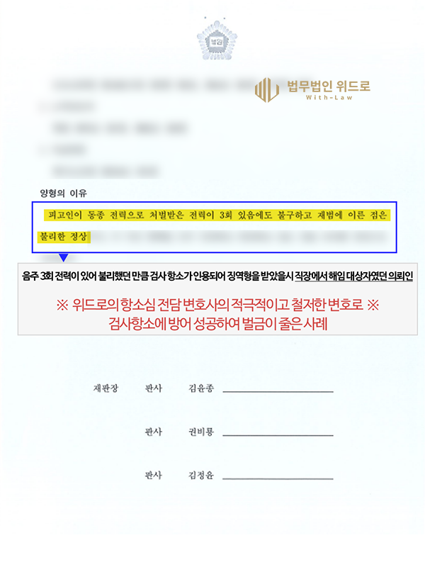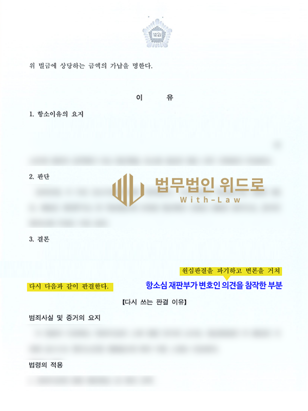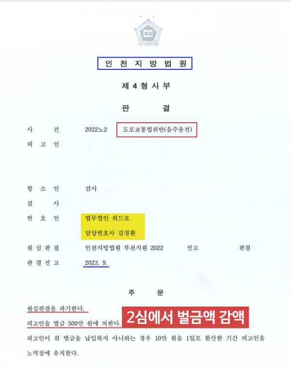 이후 항소심에서 위드로 교통범죄 전담 변호사는 항소이유서 등 2심에 필요한 법률조력을 철저하게 진행하였고, 그 결과 항소심에서 1심보다 더 낮은 금액의 벌금형으로 감형되어 선고되었습니다.