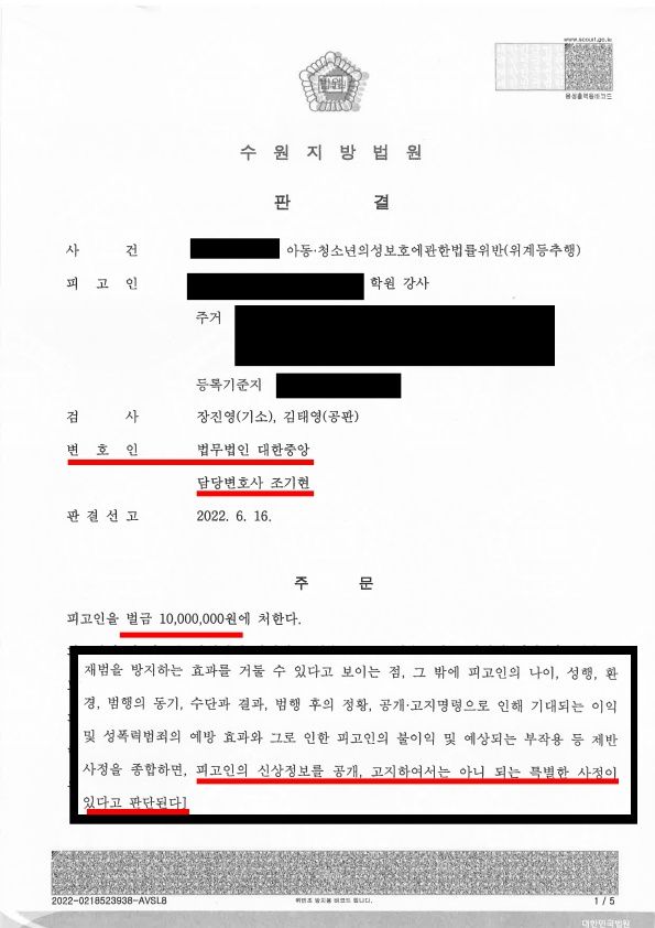 법원은 조기현 변호사의 주장을 받아들여 벌금형을 선고하였고 검사의 신상공개 청구도 기각하여 신상공개 면제 처분을 받을 수 있었습니다. 13세의 아동을 대상으로 한 성범죄로 무죄를 인정하기 어려운 상황에서 현실적으로 받을 수 있는 가장 경미한 처벌을 받은 것입니다.