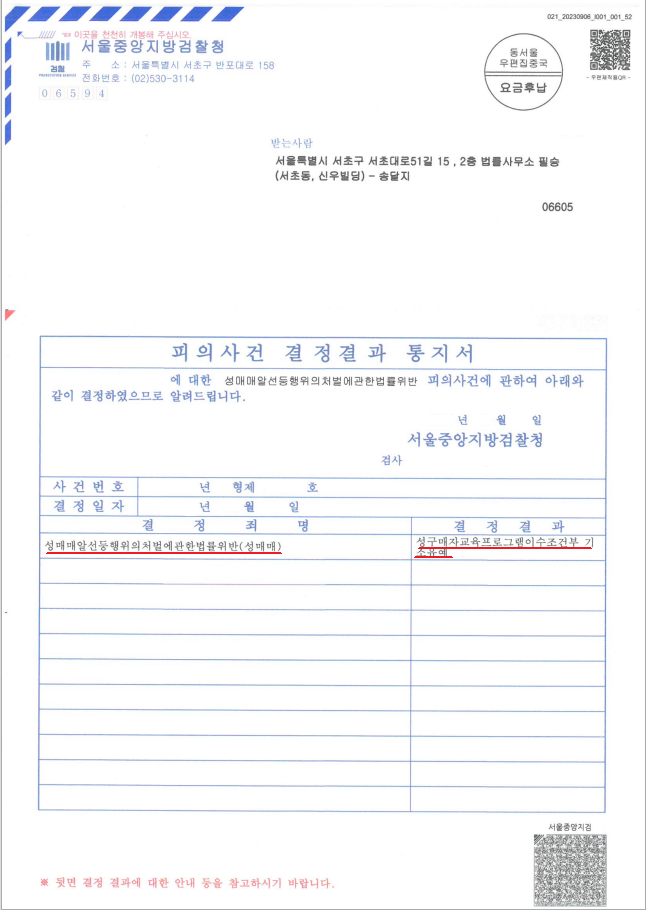 의뢰인님께서는 최근 성매매 처벌 수위에 비추어 벌금형이 선고될 위험이 높은 상황이었습니다. 그러나 앞서 말씀드린 다양한 방법으로 경찰, 검찰 수사 단계를 신중히 진행하였습니다.