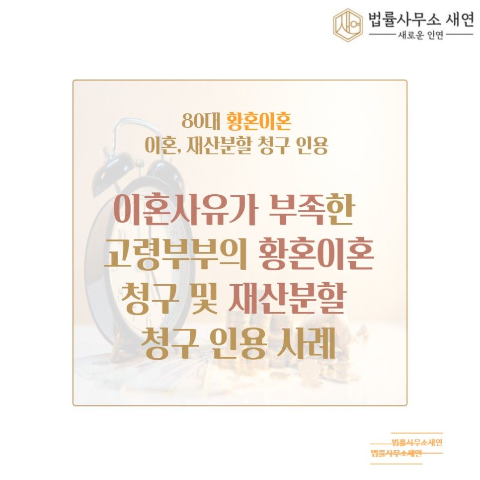 이 사건의 경우 부부의 나이가 80세를 넘어 90세를 향해가고, 부부가 사는 집 한채와 연금 외에는 이렇다 할 재산도 없는 상황에서 배우자의 뚜렷한 유책사유 없이 이혼 및 재산분할 청구를 인용시키기까지 많은 어려움이 있었습니다.