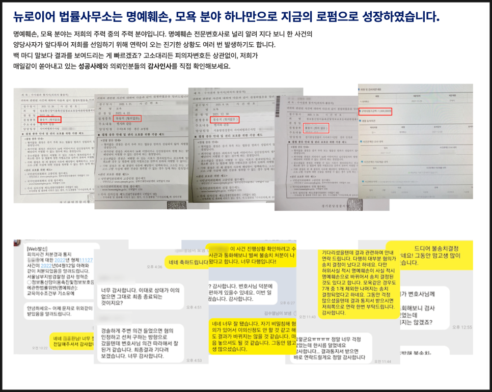 여러분들을 위해 아래와 같이 인터넷모욕죄 사건에서 다수의 경찰 불송치(무혐의)를 이끌 수 있었던 노하우를 모두 공개하겠습니다.