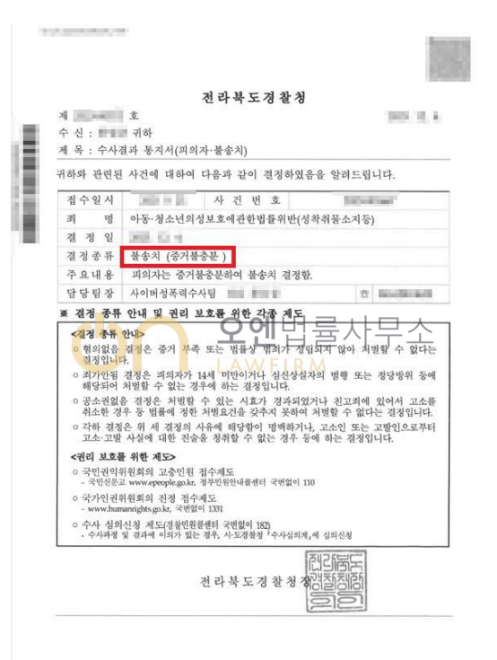 의뢰인의 아동청소년의 성보호에 관한 법률위반(성착취물소지, 성착취물배포)의 범죄사실에 대하여 경찰의 불송치(증거불충분)결정을 이끌어 냈습니다.