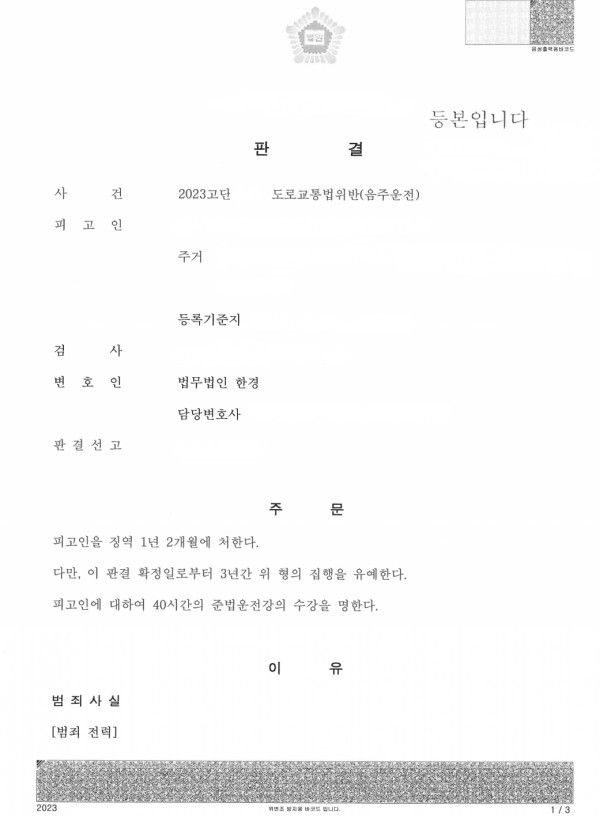 음주운전 사건에서 양형자료를 준비하는 과정이 중요합니다. 이에 한경 변호인단은 의뢰인분과 함께 체계적으로 양형자료를 준비하였고, 대표변호사가 직접 경찰조사에 참여하여 의뢰인이 처한상황을 수사기관에 어필하였습니다. 의뢰인분은 최대한 반성을 하면서 한경 변호인단과 함께 재발 방지를 위한 양형자료를 충실하게 준비하여 재판에 임하였습니다.