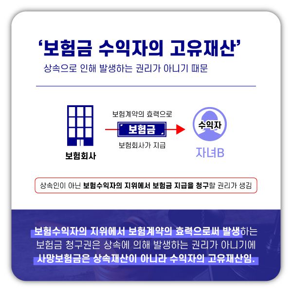 즉, 보험금 청구권은 상속에 의해 발생하는 권리가 아니라, 보험계약의 효력으로써 생기는 것이기 때문에 피상속인 사망 이후에 보험금 수익자인 상속인이 직접 보험회사를 상대로 수령할 수 있는 권리라는 것입니다.