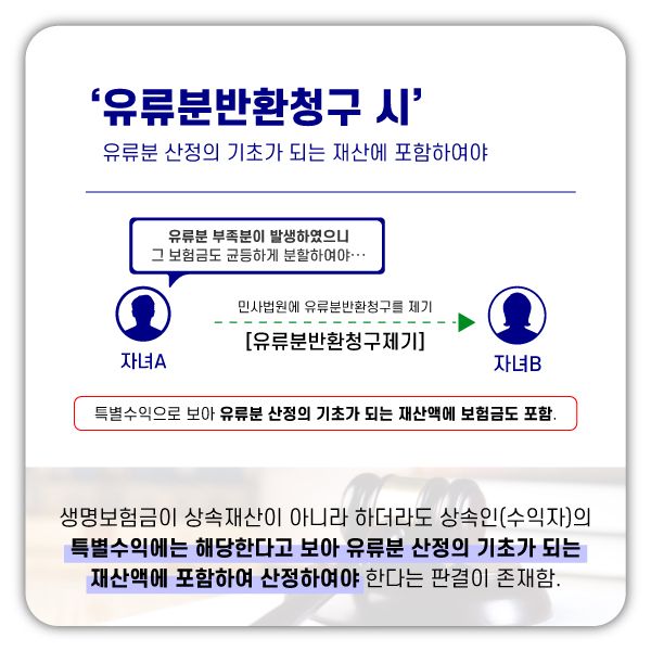 위와 같이 상속인이 수령하게 되는 피상속인의 사망보험금을 상속재산이 아니라 상속인의 고유재산으로 본다 하더라도, 상속재산분할심판청구나 유류분반환청구 등 상속 소송에서는 조금 더 자세하게 분석할 필요가 있습니다.