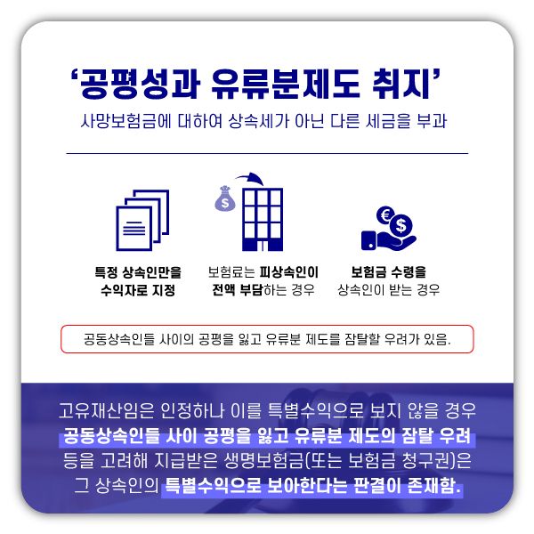 만일 그 보험금 청구권이 상속인의 고유재산이기에 특별수익으로 보지 않는다면 일부 상속인만을 수익자로 지정하여 보험금을 지급받게 하고 보험료는 피상속인이 전액 부담함으로써 공동상속인들 사이의 공평을 잃고 유류분 제도를 잠탈할 우려가 있는 점 등을 고려해