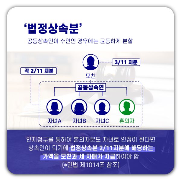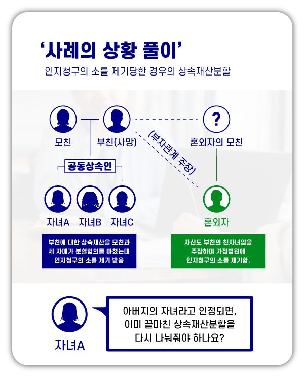 그런데 몇 달 전에 저희가 알지 못하는 분이 아버지의 친자녀라고 하면서 법원에 인지청구를 하였고, 어머니와 저희 세 자매도 법원으로부터 통지를 받게 되었습니다.
