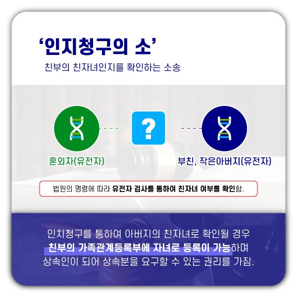 ※ 인지청구를 통해 아버지의 친자녀라고 주장하는 분이 친생자임이 확인된다면, 그 인지된 분(인지청구를 제기하여 친자녀로 인정받은 자)은 친부의 가족관계등록부(구 호적)에 자녀로 등록이 가능합니다.