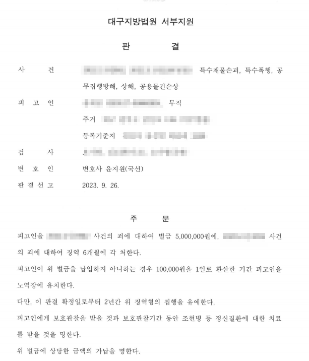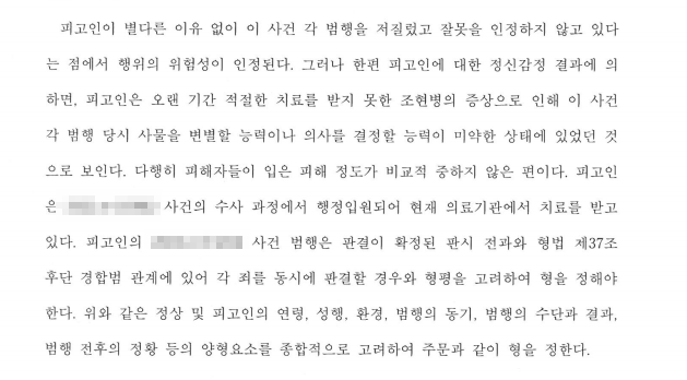 피고인이 오랜 기간 치료를 받지 못한 조현병의 증상으로 인해 심신 미약 상태로 판단되고, 행정 입원되어 이미 의료기관에서 치료받고 있는 점, 피고인의 일부 행위는 사후적 경합범에 해당한다는 점을 토대로 집행유예 판결을 받았습니다.