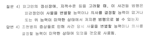 공소사실을 인정하냐는 변호인의 물음에 대해서도 엉뚱한 대답을 하고 소리를 지르는 등 대화가 불가능한 상태였습니다. 변호인은 피고인에 대한 정신감정을 신청하였고, 국립법무병원 정신감정 결과 피고인은 행위 당시 심신미약 상태로 판단되었습니다.
