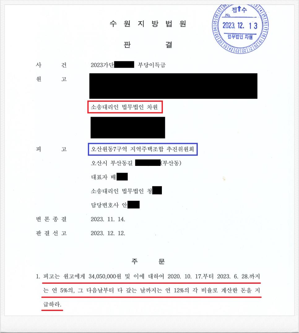 그러나, 가입 후 오산원동7구역 지역주택조합 추진위원회 측의 사업이 계획대로 진행되지 않았고, 이에 의뢰인은 정식 민사소송을 통하여 기 납입한 분담금의 반환을 원하셨습니다.