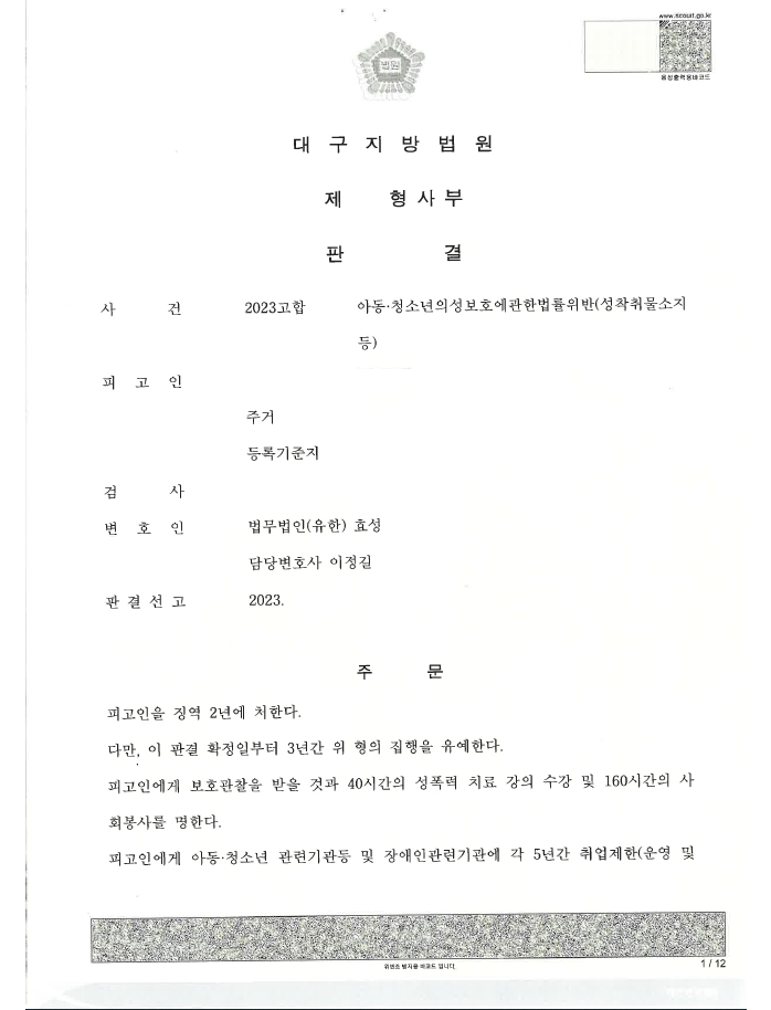 저는 공판 단계에서 이 사건의 경위, 피고인의 반성, 유포하지 않은 점, 정신과 상담 등을 받는 등 재범의 위험이 없음을 적극적으로 주장 입증하였고 법원은 집행유예를 선고하였습니다.