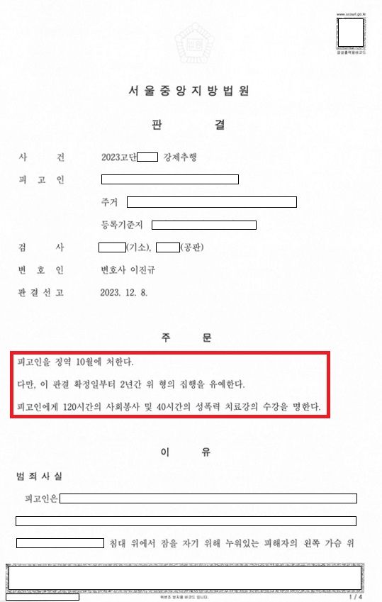이 사건 담당 재판부는 '피해자가 이 사건으로 인하여 상당한 정신적 충격과 성적 수치심을 겪은 것으로 보이는 점', '피해자로부터 용서받지 못한 점', '피고인(의뢰인)이 과거 준유사강간죄로 징역형의 집행유예 처벌을 받은 전력이 있는 점' 등을 불리한 정상으로 판단하면서도 변호인이 주장한 유리한 양형사유들을 받아들여 의뢰인분께 집행유예의 형을 선고하면서 의뢰인분에 대한 공개, 고지명령 및 취업제한 명령을 면제하였습니다.