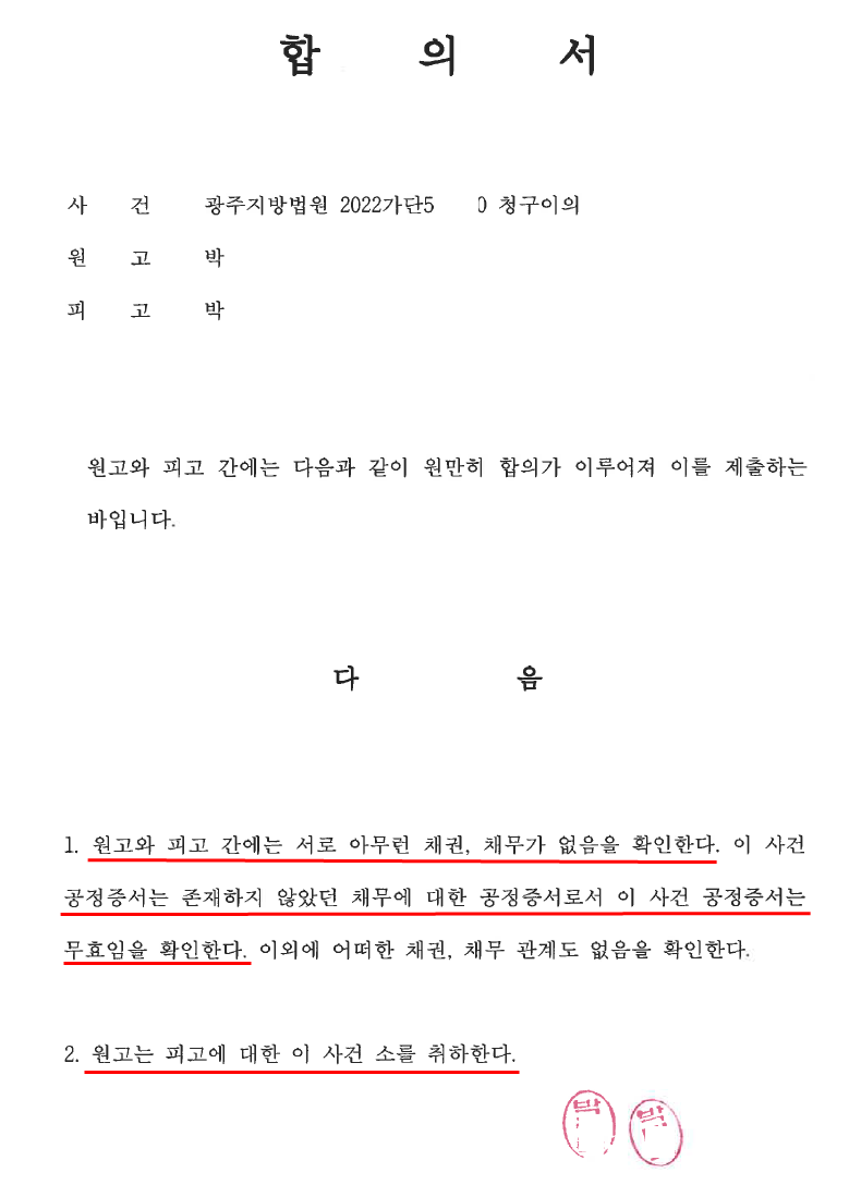 피고는 결국 김준성 변호사의 위 주장을 받아들여 해당 공정증서는 무효임을 확인하였고, 이에 원고는 이 사건 소를 취하하였습니다.