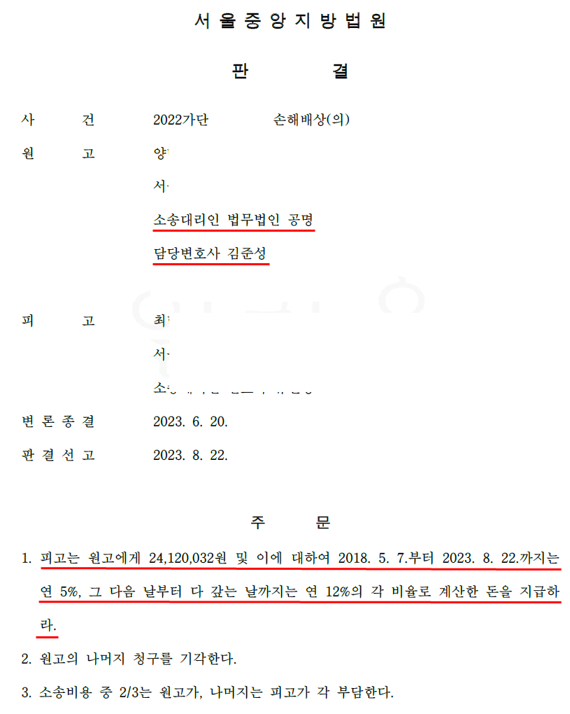 서울중앙지방법원은 김준성 변호사의 위 주장을 받아들여 원고 일부 승소판결을 선고하였습니다.