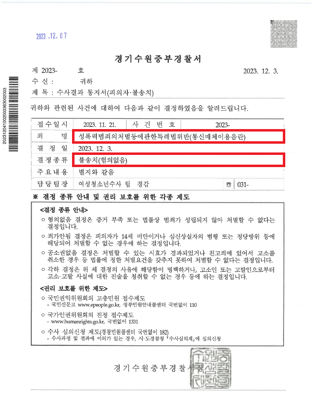 이러한 저의 조력을 바탕으로 A씨는 '불송치(혐의없음)' 결정을 받음으로써 섣불리 대응하였다면 얼마든지 될 수 있었던 성범죄자가 될 위기에서 벗어날 수 있었습니다.