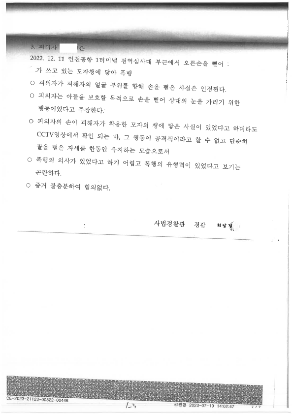이에 피의자의 아들 또한 격분하여 피해자에게 달려들기 직전의 상태까지 가게 되었고, 피의자는 아들이 실수하는 것을 막고자 아들의 앞에서 다가오는 피해자에게 손을 내밀어 피해자를 막게 되었습니다.