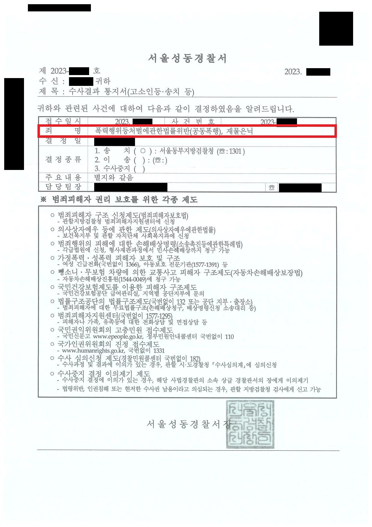 경찰에서는 이 사건 가해자들에 대하여 공동폭행, 재산은닉의 혐의가 인정되어 최종적으로 기소의견으로 검찰에 송치되었습니다. 이 사건의 경우 폭력행위 등 처벌에 관한 법률상의 공동폭행이 인정되는지 여부가 가장 핵심인 사건이었는데 다행히 혐의가 인정될 수 있었습니다. 또한, 가해자들이 의뢰인의 소중한 기록들이 저장된 핸드폰을 가져가 돌려주지 않는 것을 인정할 수 있는지 여부였는데 이 혐의에 대하여 재산은닉죄로 수사기관을 설득시킬 수 있어서 다행이라고 생각하였습니다.