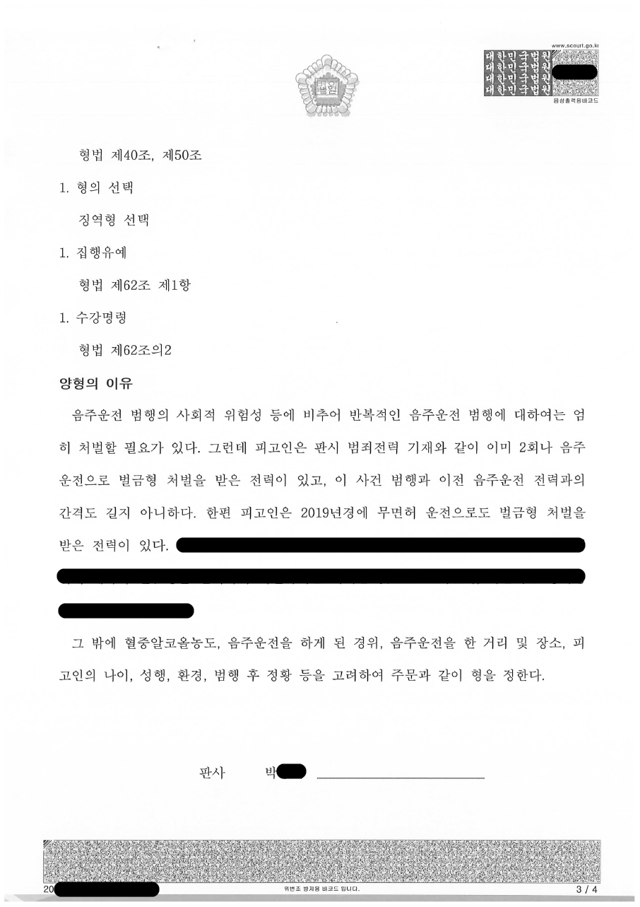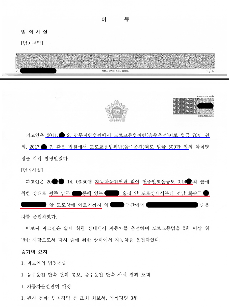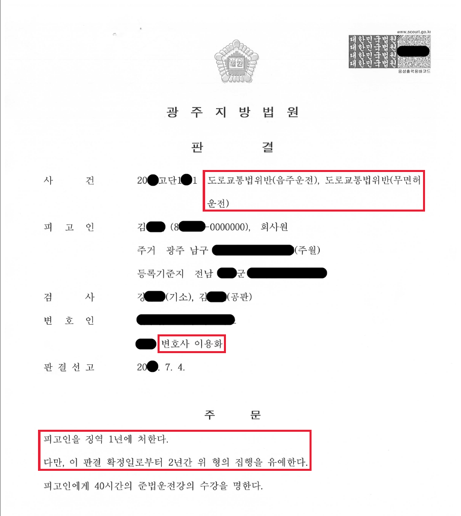 광주지방법원 20ㅁㅁ고단1ㅁㅁ1 도로교통법위반(음주운전, 무면허운전)