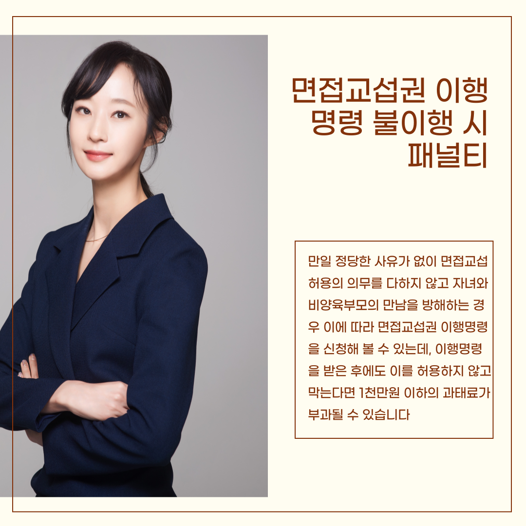 만일 정당한 사유가 없이 면접교섭허용의 의무를 다하지 않고 자녀와 비양육부모의 만남을 방해하는 경우 이에 따라 면접교섭권 이행명령을 신청해 볼 수 있는데, 이행명령을 받은 후에도 이를 허용하지 않고 막는다면 1천만원 이하의 과태료가 부과될 수 있습니다. 또한 드문 상황이기는 하지만 비양육자의 청구에 따라서 양육자변경에 대한 심판이 청구되어 자칫 양육권과 친권을 박탈당하는 일이 발생할 수 있으므로 각별히 주의하여 문제가 되는 상황이 생기지 않게끔 대응해야 합니다.
