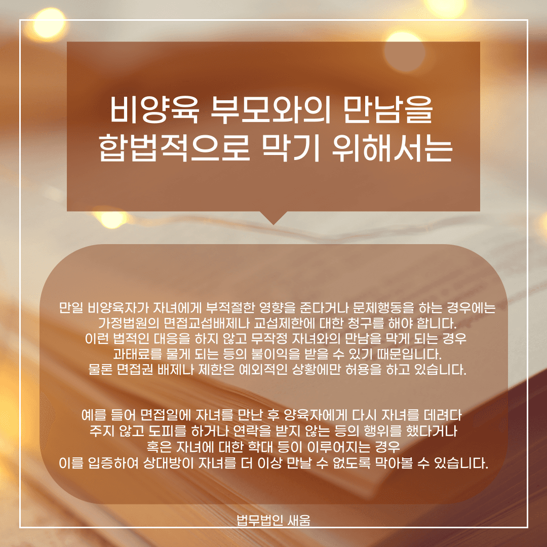 만일 비양육자가 자녀에게 부적절한 영향을 준다거나 문제행동을 하는 경우에는 가정법원의 면접교섭배제나 교섭제한에 대한 청구를 해야 합니다. 이런 법적인 대응을 하지 않고 무작정 자녀와의 만남을 막게 되는 경우 과태료를 물게 되는 등의 불이익을 받을 수 있기 때문입니다. 물론 면접권 배제나 제한은 예외적인 상황에만 허용을 하고 있습니다. 자녀가 부모를 만나는 것은 당연한 권리이기 때문에 이를 제한하는 것을 조심스럽게 판단하고 있기 때문인데요. 예를 들어 면접일에 자녀를 만난 후 양육자에게 다시 자녀를 데려다 주지 않고 도피를 하거나 연락을 받지 않는 등의 행위를 했다거나 혹은 자녀에 대한 학대 등이 이루어지는 경우 이를 입증하여 상대방이 자녀를 더 이상 만날 수 없도록 막아볼 수 있습니다.