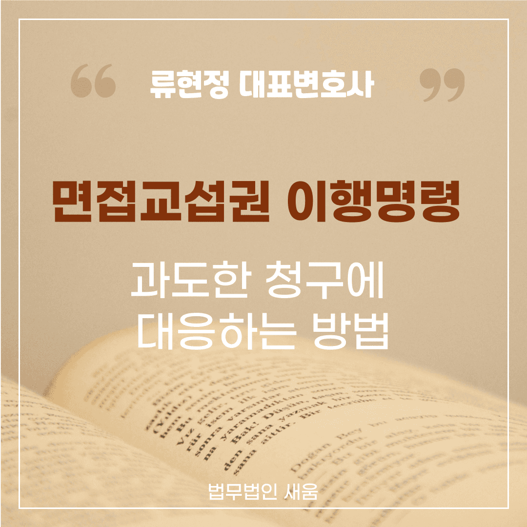 이와 같은 과도한 청구로 인해 법무법인의 새움을 받은 사례가 있습니다. 의뢰인 A씨는 배우자 B씨와 이혼을 하기 위해 본 법인을 찾아와 도움을 받게 됩니다. 상대방이 출산을 한 후에 자녀만 두고 가출을 했고 이로 인해서 A씨 혼자 자녀를 양육하게 된 상황이었기에 이혼을 하게 되었는데요. B씨는 이혼소송이 진행되는 중에도 한 번도 양육권을 주장하지 않았습니다. 그렇기에 양육자는 자연스레 A씨가 되었고 B씨는 면접교섭을 하는 방향으로 판결을 선고되었는데요. 이대로 사건이 잘 마무리가 되는 듯 하였으나, B씨가 판결이 내려오자마자 A씨에게 교섭권을 이행할 것을 촉구하는 이행명령을 신청하게 되면서 다시 문제가 발생하게 되었습니다.