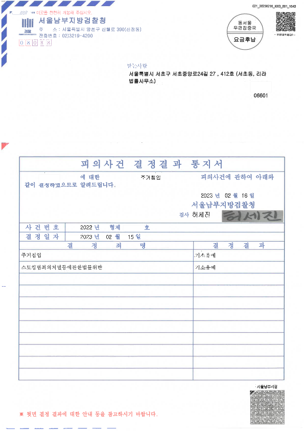 다행히도 피의자는 기소유예 처분으로 사건을 잘 마무리 할 수 있었습니다.