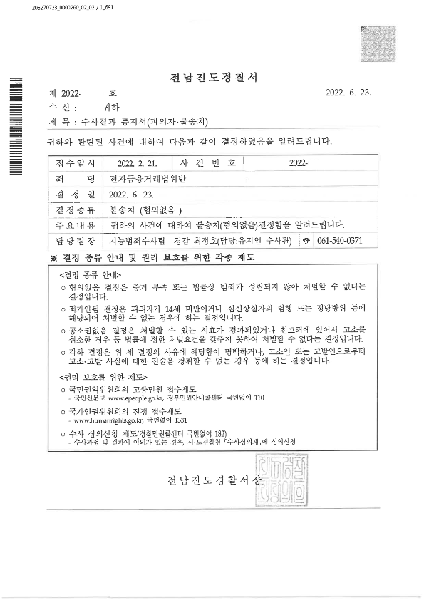 이에 피의자는 사기혐의와 전자금융거래법위반혐의 모두 불송치를 받아 사건을 잘 마무리할 수 있었습니다.