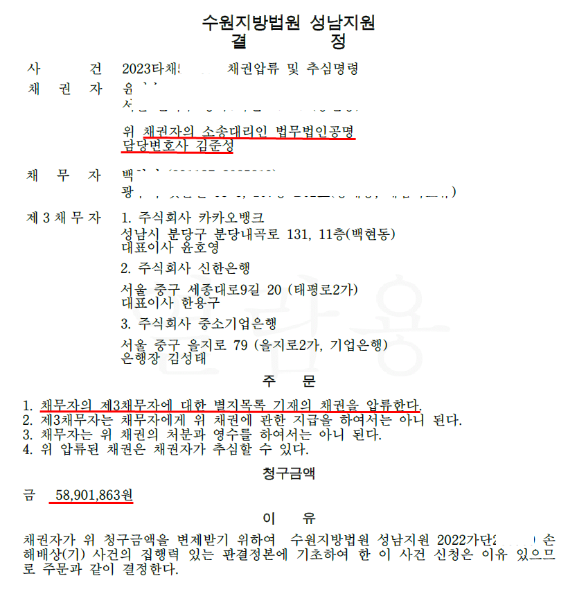 [채권압류 및 추심명령] : 김준성 변호사의 도움으로 인용 결정