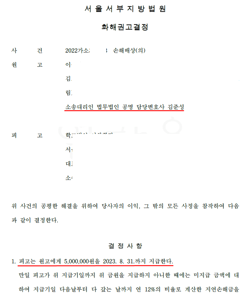 서울서부지방법원은 김준성 변호사의 위 주장을 받아들여 화해권고결정을 하였습니다.