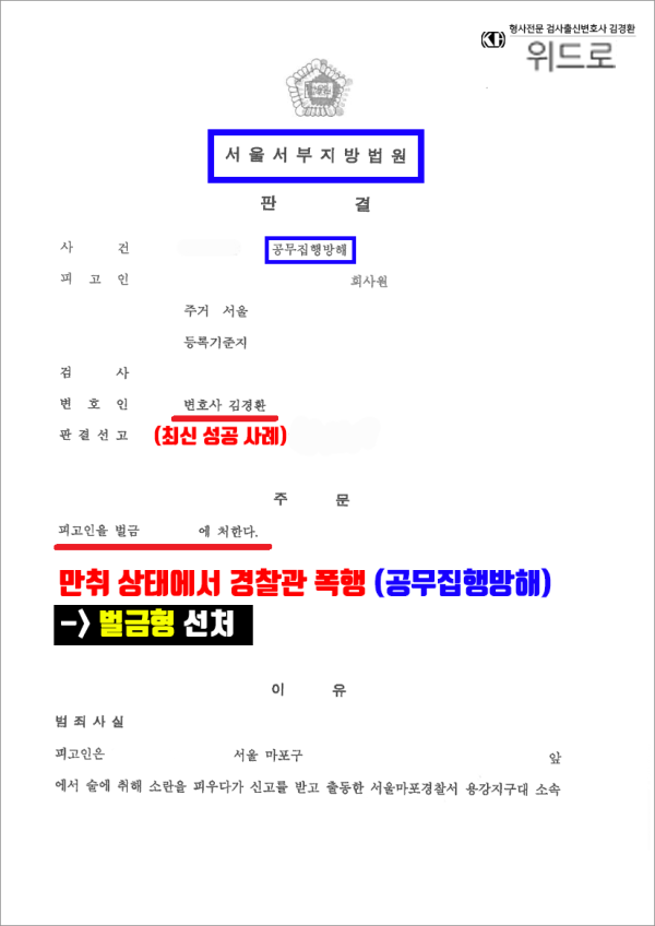 경찰관을 폭행하는 행위는 공무집행방해죄에 포함되어 처벌 수위가 굉장히 높고 선처도 쉽지 않습니다. 하지만 충분히 이를 유리하게 변호할 수 있는 조건들이 구축되어 있었고 결국 위드로 대표 변호인의 체계적인 대응으로 재판부에서는 모든 사정을 참작하여 벌금형 선고로 해고 문제까지 이어지지 않는 선에서 사건을 종결할 수 있었고 피고인도 그 동안 심적으로 고생이 많았던 만큼 눈물을 보이면서 오늘 일을 계기로 더 열심히 살겠다고 하면서 다시 예전의 일상을 회복을 위해 나아갔습니다.