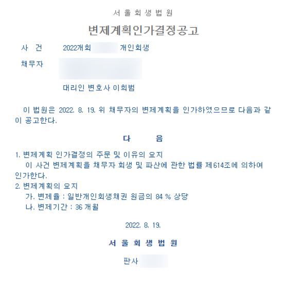 해당 사례의 채무자는 변제기간 36개월에 변제율은 채무 원금의 84% 상당으로 최종적으로 변제계획안이 인가되어 3개월째 월 변제금을 성실히 회생위원의 계좌로 임치하고 계십니다.
