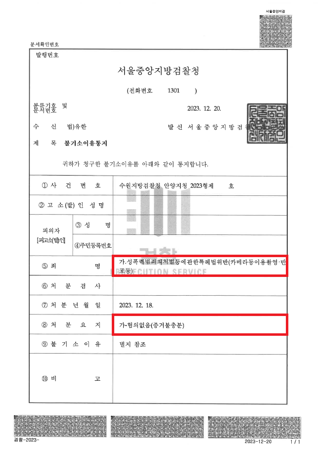 이러한 저의 조력을 바탕으로 A씨는 '혐의없음(증거불충분)' 처분을 받음으로써 억울하게 성범죄자가 될 위기에서 벗어날 수 있었습니다.