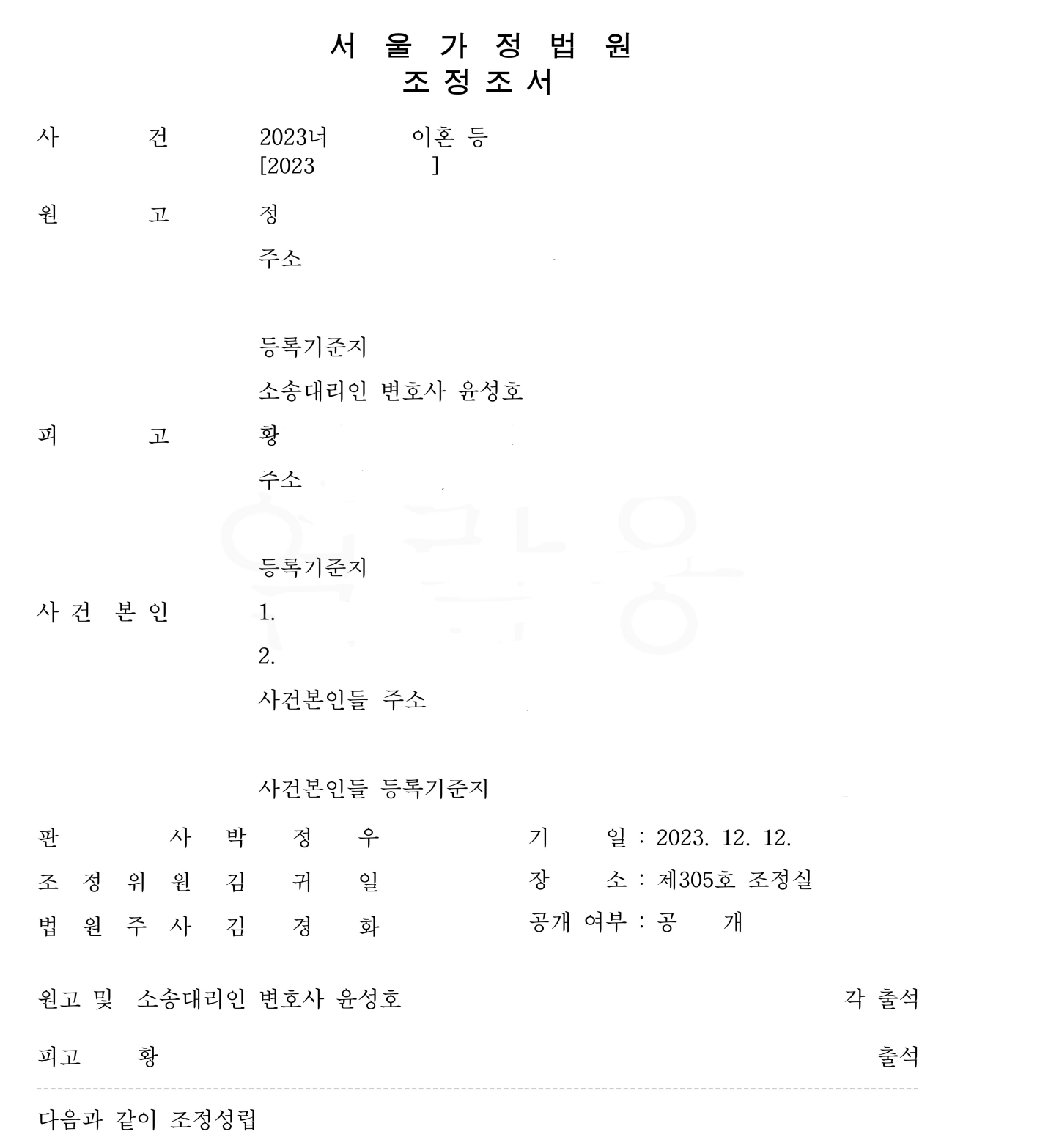 심도 있는 논의 끝에 의뢰인께서도 만족할 만한 합의안을 도출 할 수 있었고, 조정이혼 신청을 통해 빠르게 이혼에