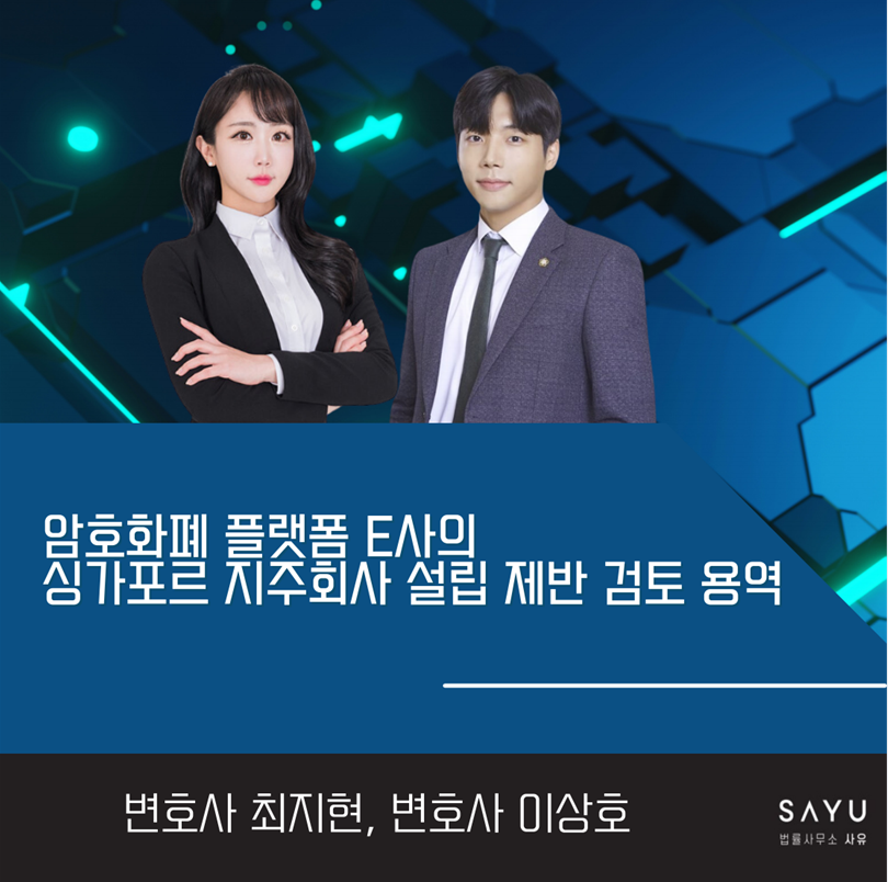 법률사무소 사유 최지현 변호사, 이상호 변호사는 암호화폐 플랫폼 E사의 경영 및 지배구조의 안정화 및 효율성 제고를 위해, E사 모자회사 구조의 적법성을 검토한 후 싱가포르에 지주회사를 설립하는 업무를 수행하였습니다.