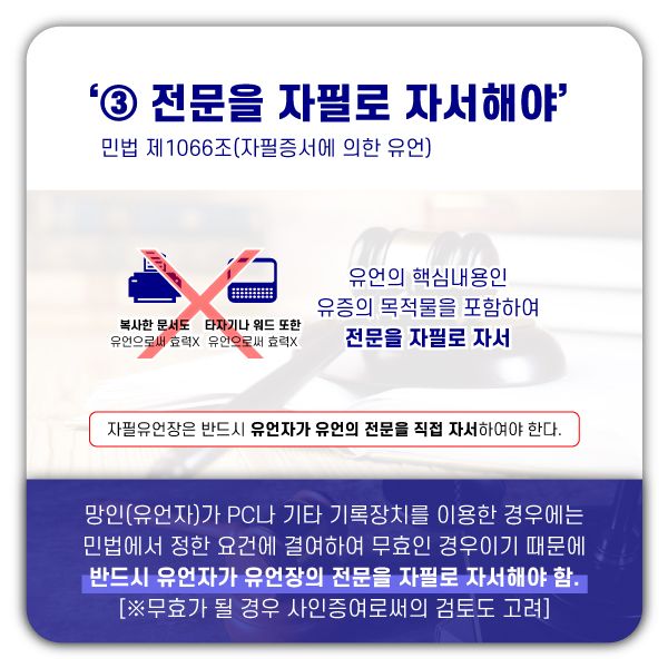 ※ 자필증서에 의한 유언(자필유언장)은 반드시 유언자 본인이 전문(全文)을 직접 자서(自書) 하여야 합니다.
