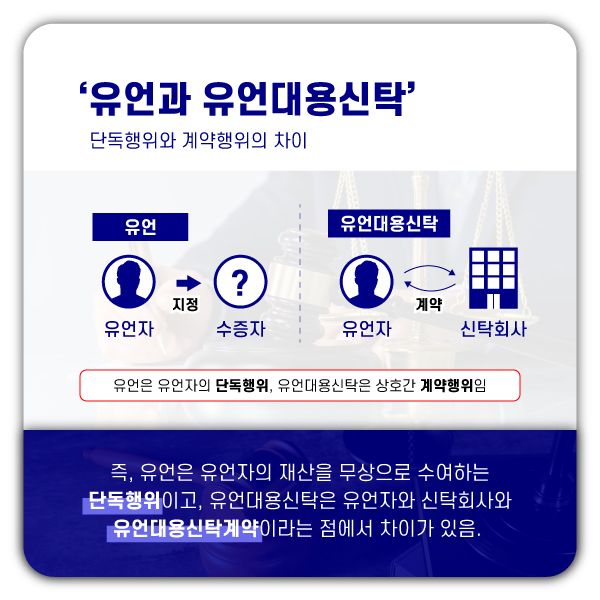 유언은 단독행위인 유언의 방식으로 이루어지는 것이고, 유언대용신탁은 유언의 방식이 아닌 신탁 계약 행위의 방식으로 이루어진다는 차이가 있습니다.