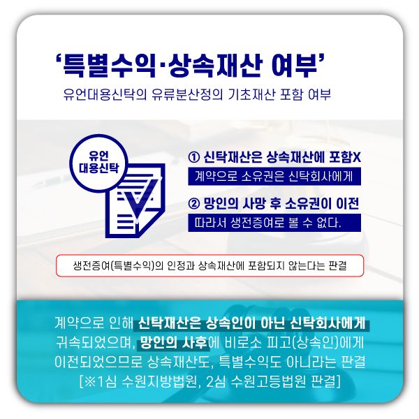 반면 유언대용신탁의 경우 최근 서울고등법원판결에 의하면(서울고등법원 2019. 2. 13. 선고 2015나2065231 판결)