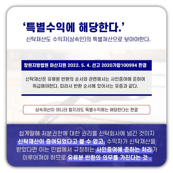 또한 망인의 사망 당시 이 사건 신탁재산은 수탁인인 L에 이전되어 대내외적인 소유권이 수탁자인 L에게 있었으므로, 이 사건 신탁재산이 망인의 적극적 상속재산에 포함된다고 보기도 어렵다.”라며 특별수익·상속재산이 둘 다 아니라고 판시한 바 있습니다.