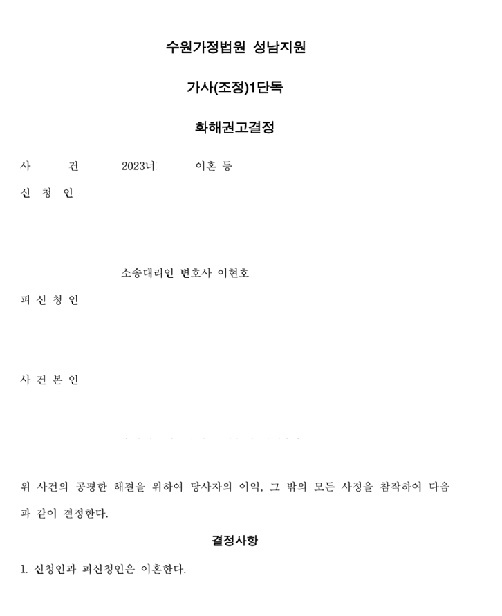 이현호 변호사는 이혼 및 기타 재산분할, 양육권 등의 사항에 대한 문구를 모두 검토하여 이혼조정신청을 법원에 접수하였고, 기타 법원에서 요청한 추가 서류를 보정한 끝에, 이혼조정을 접수하고 약 한달 반만에 화해권고결정을 받을 수 있었습니다.