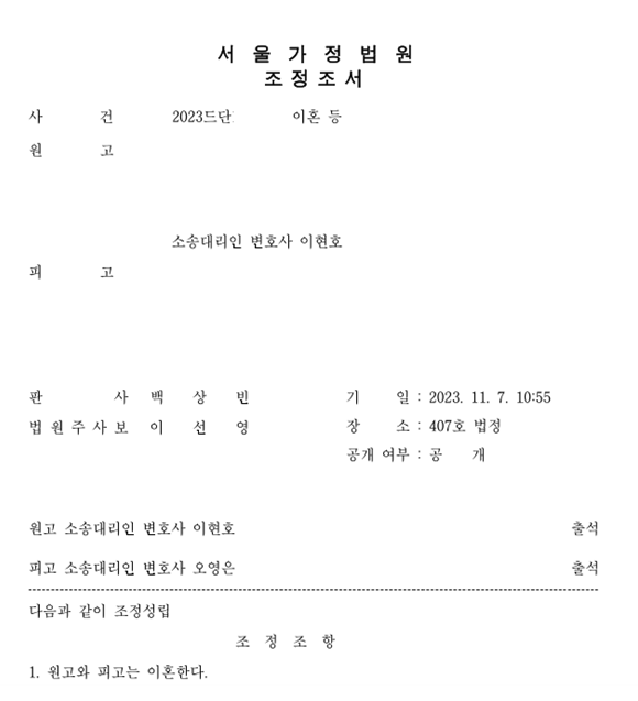 의뢰인은 조정이 성립되고 바로 이혼조정조서와 송달증명서를 발급받아 이혼신고 절차를 마무리할 수 있었습니다.