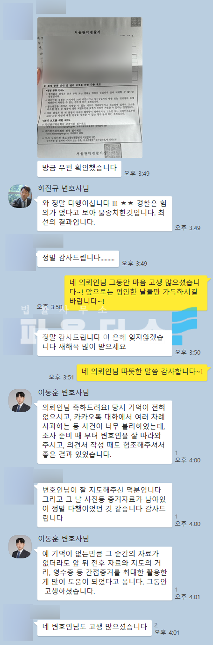 이와 같이 변호인의 적극적인 조력으로 의뢰인은 경찰 단계에서 불송치 결정을 받을 수 있게 되었고 조속한 시일에 사건을 마무리할 수 있었습니다.
