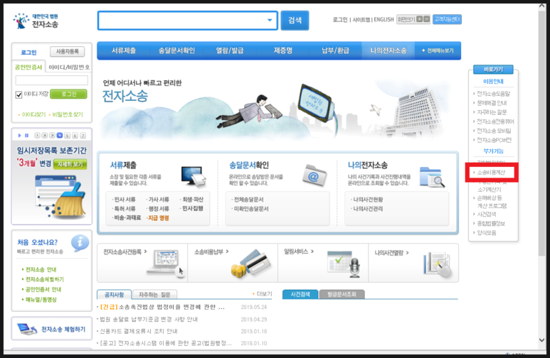 1) 아래 대한민국법원 전자소송 홈페이지로 들어가서 우측 배너의 '소송비용계산' 메뉴를 클릭!
