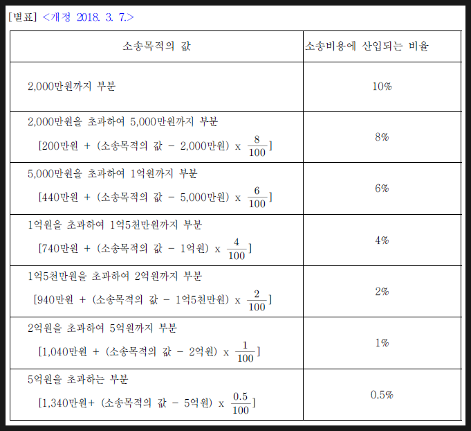 3. 소송목적의 값이 1억원 이상 10억원 미만인 경우에는 그 값에 1만분의 40을 곱한 금액에 5만5천원을 더한 금액