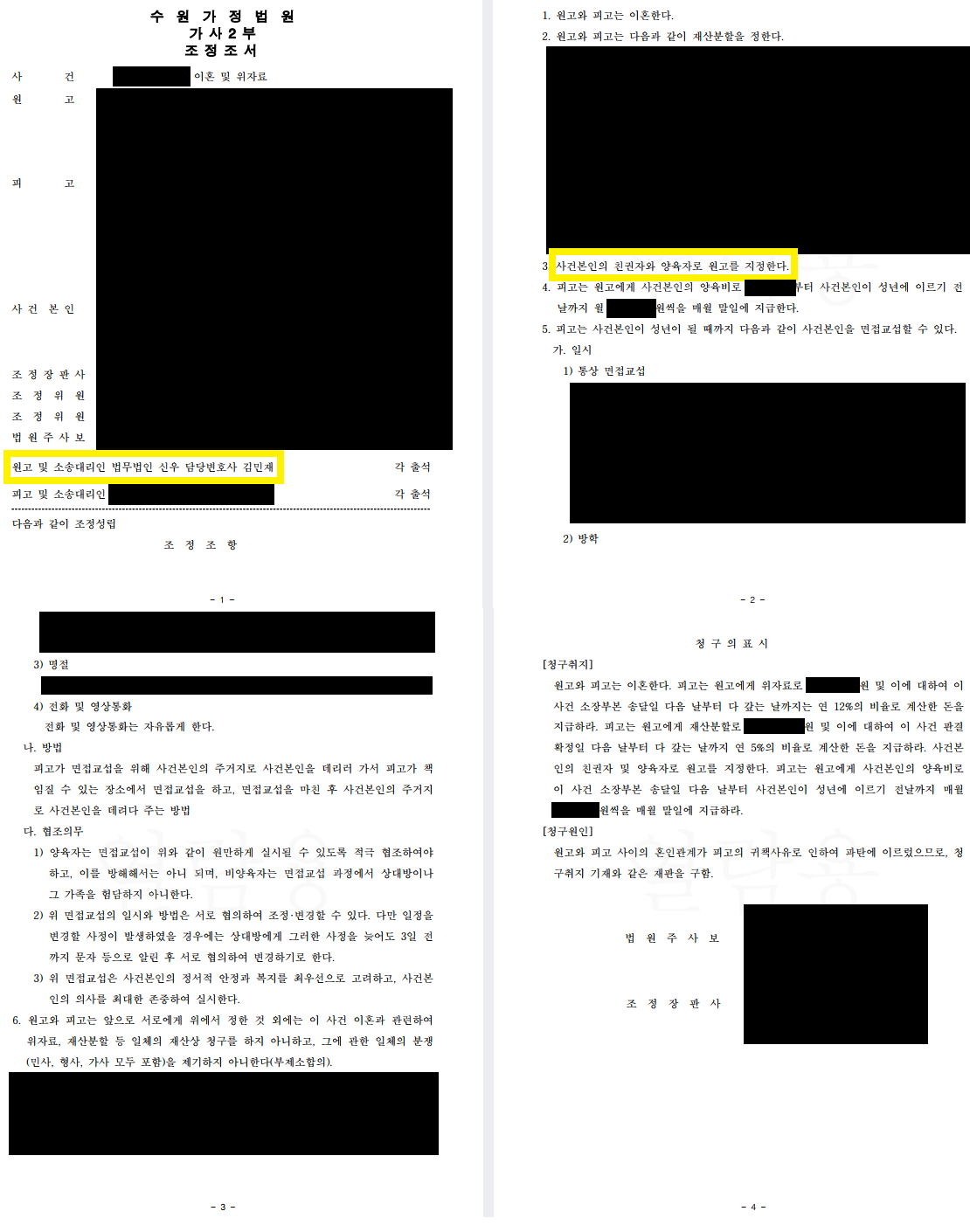 조정을 통한 이혼과 양육권, 그리고 자녀 양육에 필요한 양육비와, 이혼에 따른 위자료 모두를 얻어 내었습니다.