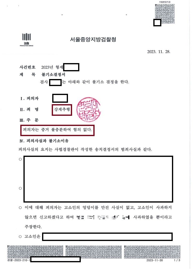 따라서 그러한 점들을 짚어 집중적으로 변론한 결과, 경찰에서 혐의인정 송치되었음에 불구하고, 검사님으로부터 무혐의 처분을 받을 수 있었습니다.