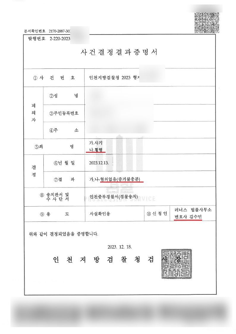 결국 의뢰인은 검찰단계에서 무혐의(증거불충분) 판단을 받았고, 사건은 종결되었습니다.