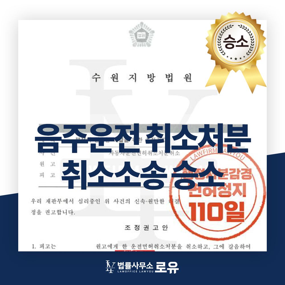 본 법률사무소는 의뢰인의 사정을 적극 호소해 운전면허취소처분을 운전면허정지처분으로 감경, 전부 승소판결을 받게 되었습니다.