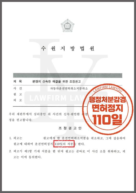 로유의 변호인은 의뢰인의 생계가 연관되어 있다는 점을 비롯해 반성문 및 기타 양형자료들을 5번의 준비 서면을 통해 강력히 호소해 조정권고안으로 운전면허취소처분을 취소하고 운전면허 정지 110일 처분 감경, 승소 판결을 이끌었습니다.